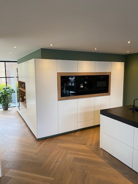 Een mooi authentiek woonhuis mogen voorzien van een compleet interieur met als pronkstuk deze mooie keuken voorzien van wit gespoten fronten gecombineerd met een eiken kader rondom de apparatuur.