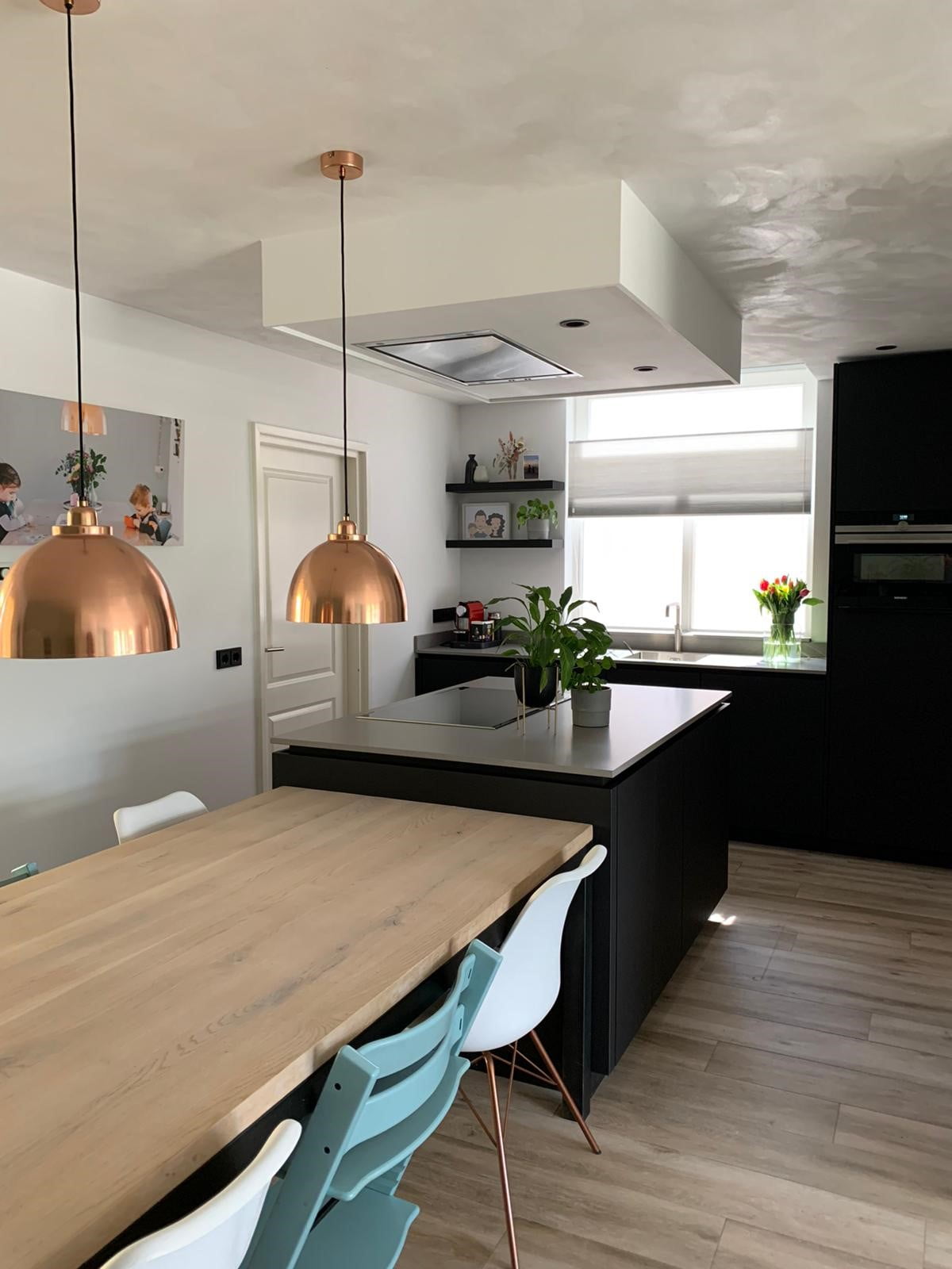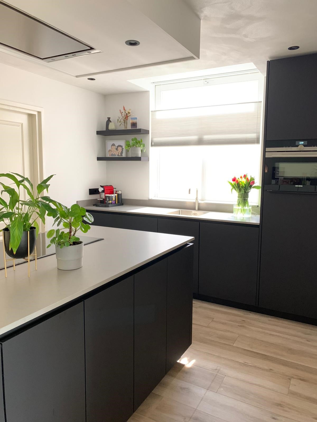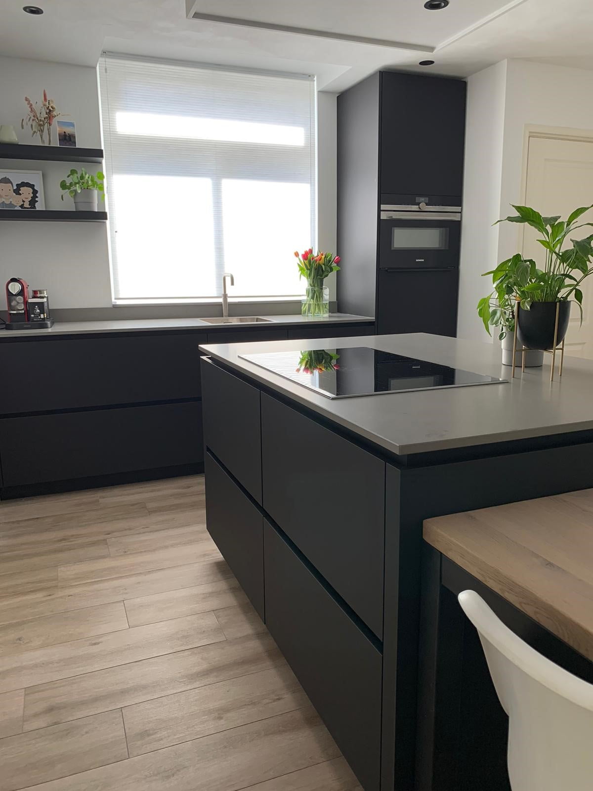 Deze fingerproof zwarte fronten zijn super strak en erg praktisch. De keuken is voorzien van een composieten werkblad. De afzuigkap is geïntegreerd in de koof dit maakt het een prachtig geheel.