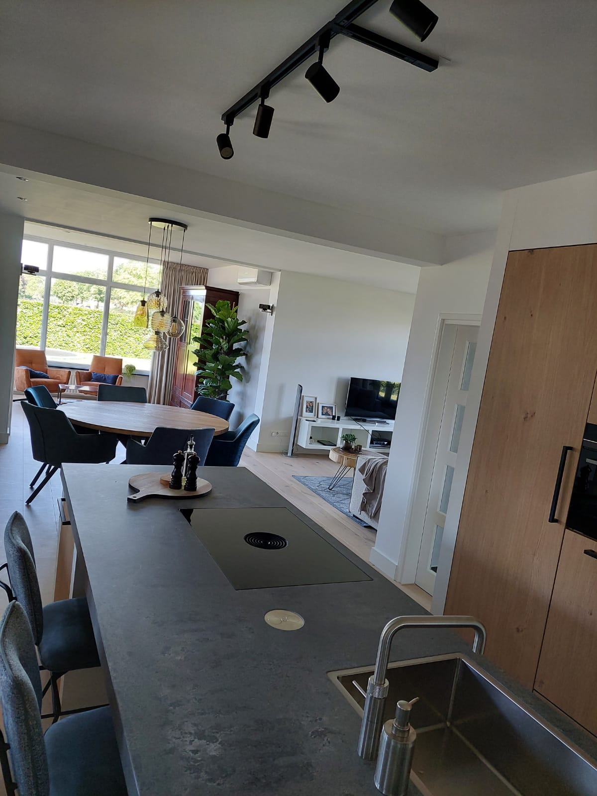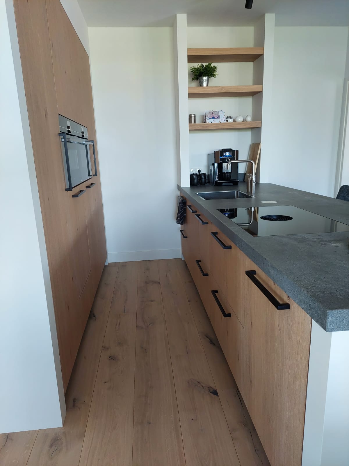Mooie gezellige keuken voorzien van eiken fineer geolied front, gecombineerd met een composieten aanrechtblad en strakke wit gespoten stolwanden om de keuken. Een mooie wijnkoeler op de kopse kant van het eiland.